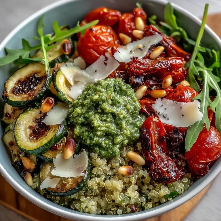 Pin This There's something about the peppery bite of arugula that catches you off guard the first time you taste it in a bowl like this. I stumbled onto this combination on a Tuesday afternoon when my farmer's market haul was looking sparse but hopeful, and I wanted to create something that felt complete without being complicated. The way the homemade pesto clings to warm quinoa while fresh greens wilt slightly underneath—that's when I knew I'd found something worth making again and again.