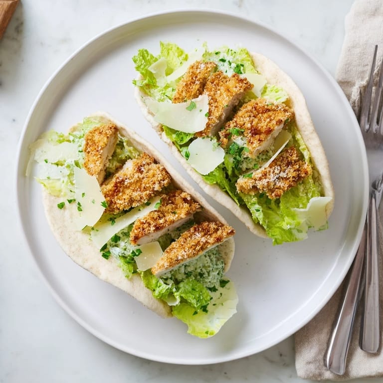 - Slice your cooked chicken into strips, cut each pita in half to create pockets, and fill each one with some of that dressed Caesar salad followed by the crispy chicken strips.